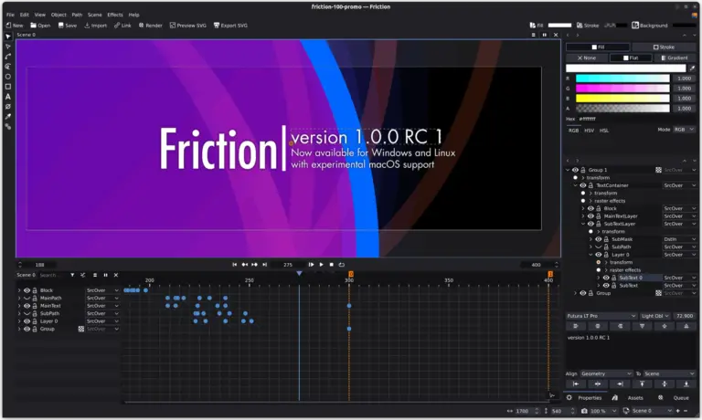 Neste cenário de incerteza e busca por soluções confiáveis, o Friction emerge como uma promissora “nova esperança”. Trata-se de um software de motion graphics e VFX de código aberto que se alinha perfeitamente com a necessidade de um fluxo de trabalho intuitivo baseado em camadas. Além disso, o Friction apresenta um design moderno e é construído sobre uma base robusta, tornando-o uma alternativa sólida (apesar de estar em fase beta) e autônoma para profissionais e entusiastas que operam no ambiente Linux.
